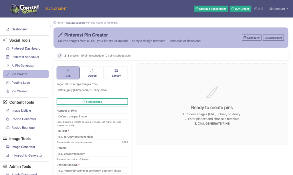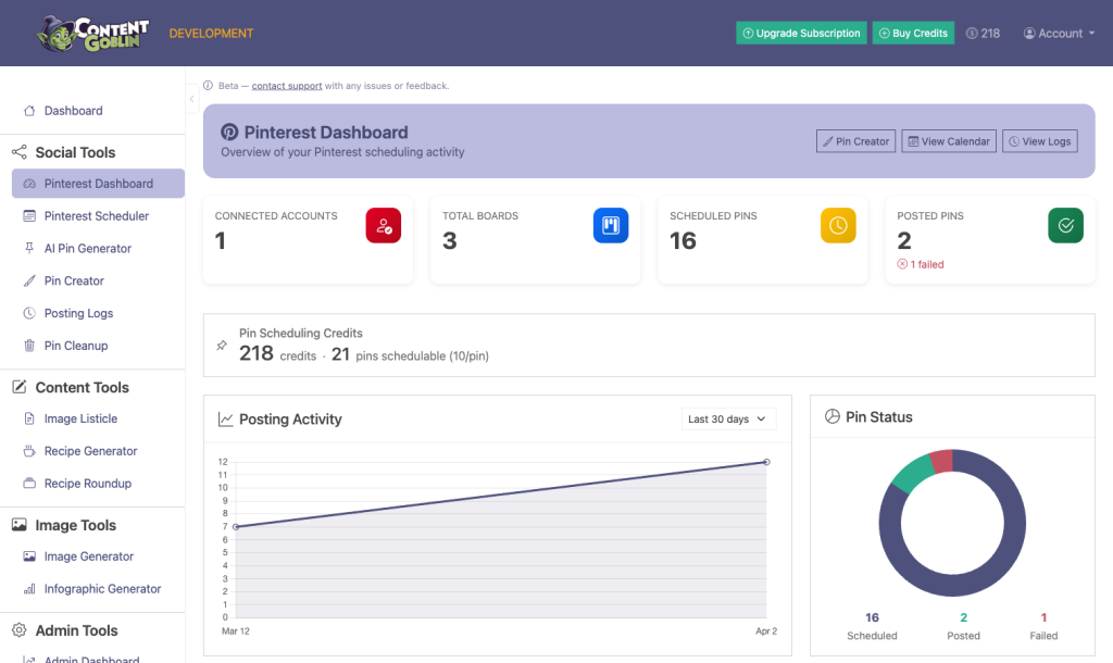 Other creators cobble together 3-4 tools just to post a pin. With Content Goblin, open one dashboard and your entire Pinterest workflow is done. Stop duct-taping your workflow together!